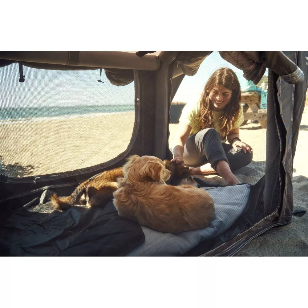 Nach dem Aufbau brauchst du lediglich die Lieblingsdecke oder das Lieblingskissen deines Hundes in die Hundehütte zu legen und schon kann dein vierbeiniger Liebling auch unterwegs den gewohnten Komfort von zuhause geniessen – Dein Hund wird das gewohnte und angenehme Ambiente in unmittelbarer Nähe zu seiner Familie sehr zu schätzen wissen. Dadurch kann er sich nach einem aufregenden Tag am Lagerfeuer oder vor dem Zelt in sicherer Geborgenheit entspannen und startet am nächsten Tag ausgeruht und topfit in das nächste Abenteuer. Zum Schutz vor lästigen Insekten und für ausreichend Belüftung ist das Dometic K9 auf 3 Seiten mit Netzeinsätzen ausgestattet, die jederzeit von aussen mit Reissverschluss-Abdeckungen verschlossen werden können.