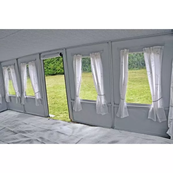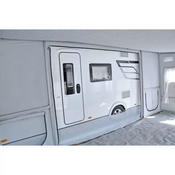 der Wohnwagen wird über einen Schleusenstreifen mit dem Zelt verbunden, zwei verschieden Abstände sind möglich